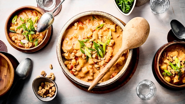 Kartoffeln waschen und schälen. Paprika waschen, halbieren, Strunk und Kerne entfernen. Beides ca. 1