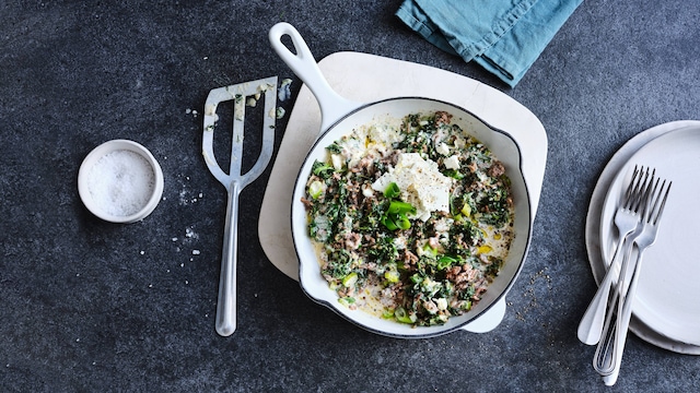 In einem Topf Reis mit ca. 700 ml Salzwasser aufkochen Wirsing-Hack-Pfanne abschmecken und mit Reis auf Tellern