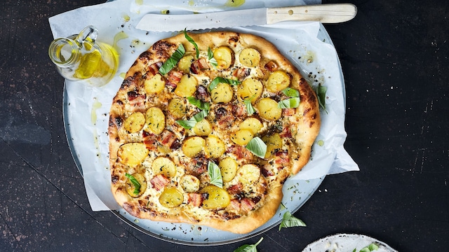 Speck in dünne Scheiben schneiden oder fein würfeln Danach Kartoffeln und Speck gleichmäßig darauf verteilen